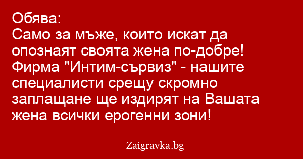 Само за мъже, които искат да опознаят своята жена по-добре! Фирма "Интим-сървиз" - нашите специалисти срещу скромно заплащане ще издирят на Вашата жена всички ерогенни зони!