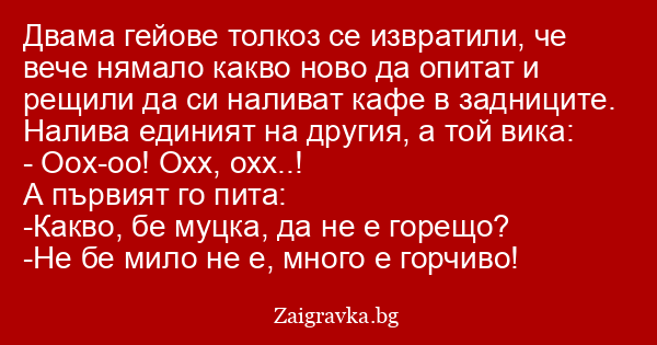 Двама гейове толкоз се извратили, че вече нямало какво ново да опитат и рещили да си наливат кафе в задниците.