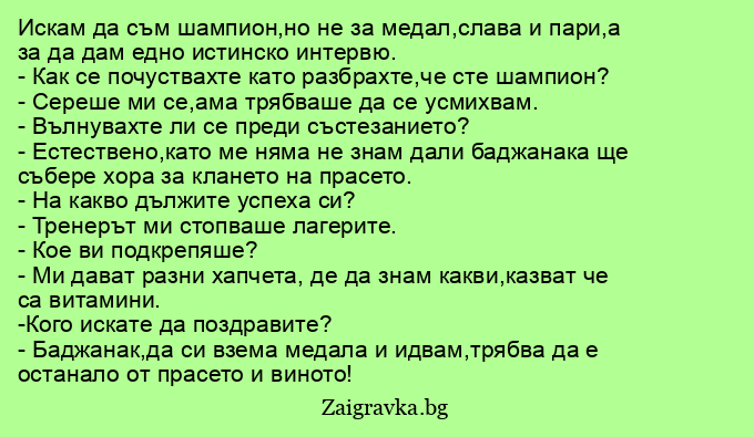 Искам да съм шампион,но не за медал,слава и пари,а за да дам едно истинско интервю.