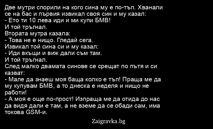 - А моя е още по-прост! Изпраща ме да отида до нас да видя дали е там, а не вземе да се обади сам, има токова GSM-и.
