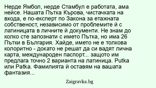 Нерде Ямбол, нерде Стамбул е работата, ама нейсе. Нашата Пътка Кърова, чистачката на входа, е по-експерт по Закона за етажната собственост, независимо от проблемите й с латиницата в личните й документи. Не знам до колко сте запознати с името Пътка, но има 26 Пътки в България. Хайде, името не е толкова колоритно - докато не решат да си вадят лична карта, международен паспорт... защото им предлага точно 2 варианта на латиница. Putka или Patka. Фамилията й оставям на вашата фантазия...