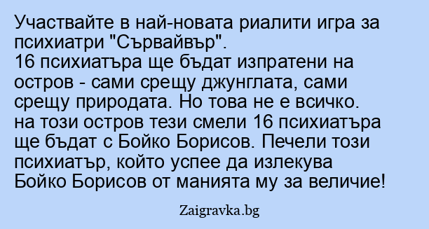 Участвайте в най-новата риалити игра за психиатри "Сървайвър".
