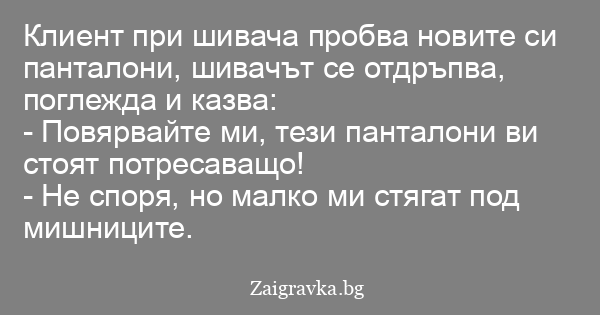 Клиент при шивача пробва новите си панталони, шивачът се отдръпва, поглежда и казва: