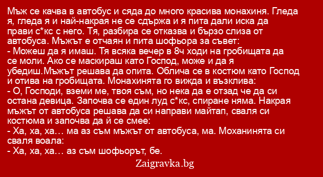 Мъж се качва в автобус и сяда до много красива монахиня. Гледа я, гледа я и най-накрая не се сдържа и я пита дали иска да прави с*кс с него. Тя, разбира се отказва и бързо слиза от автобуса. Мъжът е отчаян и пита шофьора за съвет: