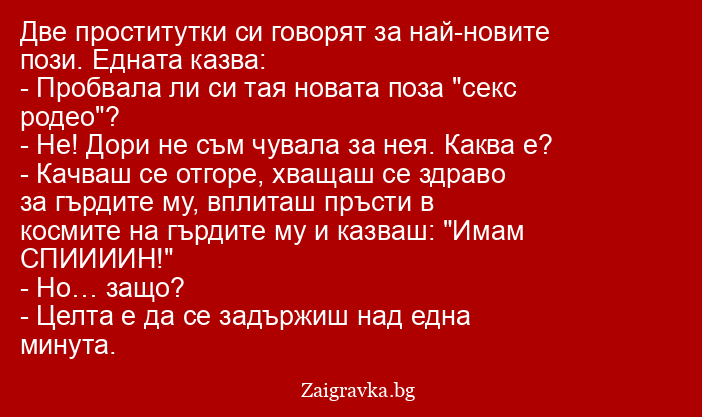 Две проститутки си говорят за най-новите пози. Едната казва: