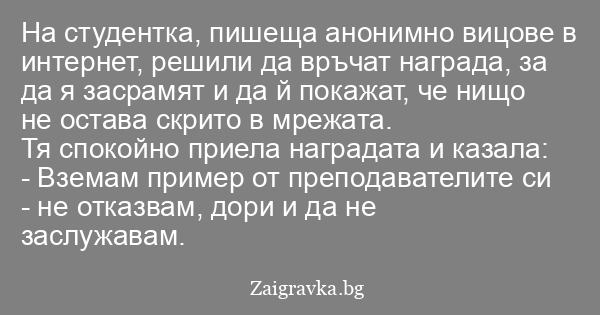 На студентка, пишеща анонимно вицове в интернет, решили да връчат награда, за да я засрамят и да й покажат, че нищо не остава скрито в мрежата.