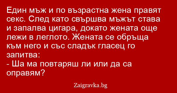 Един мъж и по възрастна жена правят секс. След като свършва мъжът става и запалва цигара, докато жената още лежи в леглото. Жената се обръща към него и със сладък гласец го запитва: