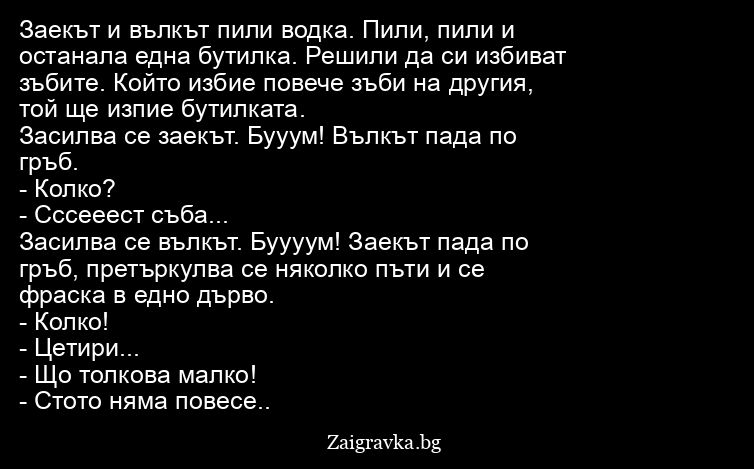 Заекът и вълкът пили водка. Пили, пили и останала една бутилка. Решили да си избиват зъбите. Който избие повече зъби на другия, той ще изпие бутилката.