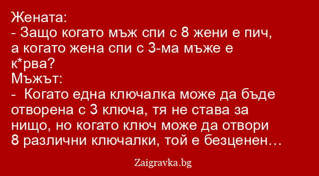 - Защо когато мъж спи с 8 жени е пич, а когато жена спи с 3-ма мъже е к*рва?