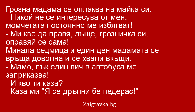 Минала седмица и един ден мадамата се връща доволна и се хвали вкъщи: