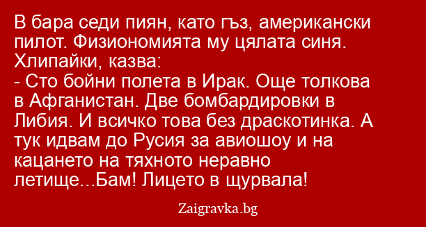 В бара седи пиян, като гъз, американски пилот. Физиономията му цялата синя. Хлипайки, казва: