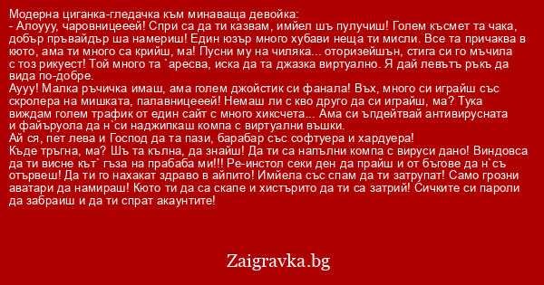 - Алоууу, чаровницееей! Спри са да ти казвам, имйел шъ пулучиш! Голем късмет та чака, добър пръвайдър ша намериш! Един юзър много хубави неща ти мисли. Все та причаква в кюто, ама ти много са крийш, ма! Пусни му на чиляка... оторизейшън, стига си го мъчила с тоз рикуест! Той много та `аресва, иска да та джазка виртуално. Я дай левътъ ръкъ да вида по-добре.