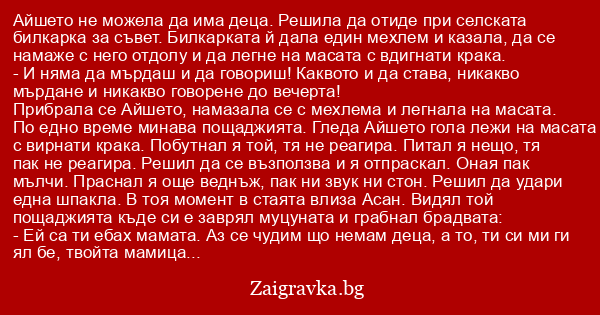 Айшето не можела да има деца. Решила да отиде при селската билкарка за съвет. Билкарката й дала един мехлем и казала, да се намаже с него отдолу и да легне на масата с вдигнати крака.