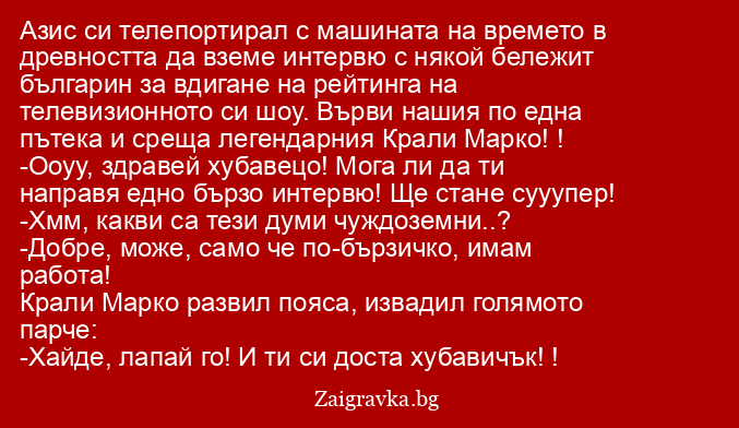 Азис си телепортирал с машината на времето в древността да вземе интервю с някой бележит българин за вдигане на рейтинга на телевизионното си шоу. Върви нашия по една пътека и среща легендарния Крали Марко! !