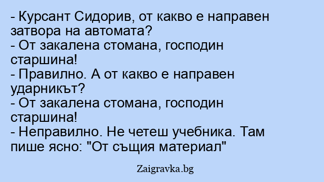 - Курсант Сидорив, от какво е направен затвора на автомата?