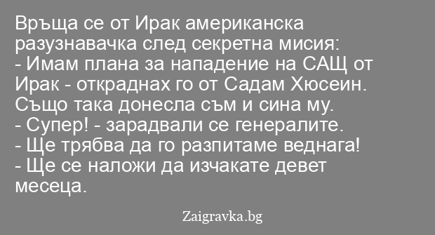 - Имам плана за нападение на САЩ от Ирак - откраднах го от Садам Хюсеин. Също така донесла съм и сина му.