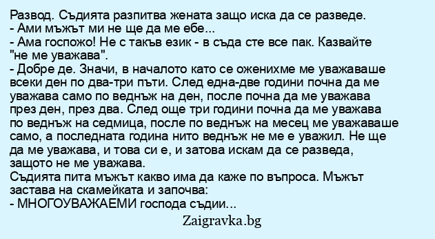 - Добре де. Значи, в началото като се оженихме ме уважаваше всеки ден по два-три пъти. След една-две години почна да ме уважава само по веднъж на ден, после почна да ме уважава през ден, през два. След още три години почна да ме уважава по веднъж на седмица, после по веднъж на месец ме уважаваше само, а последната година нито веднъж не ме е уважил. Не ще да ме уважава, и това си е, и затова искам да се разведа, защото не ме уважава.