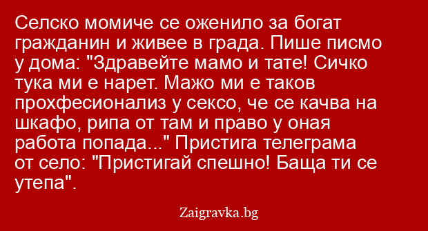 Селско момиче се оженило за богат гражданин и живее в града. Пише писмо у дома: "Здравейте мамо и тате! Сичко тука ми е нарет. Мажо ми е таков прохфесионализ у сексо, че се качва на шкафо, рипа от там и право у оная работа попада..." Пристига телеграма от село: "Пристигай спешно! Баща ти се утепа".