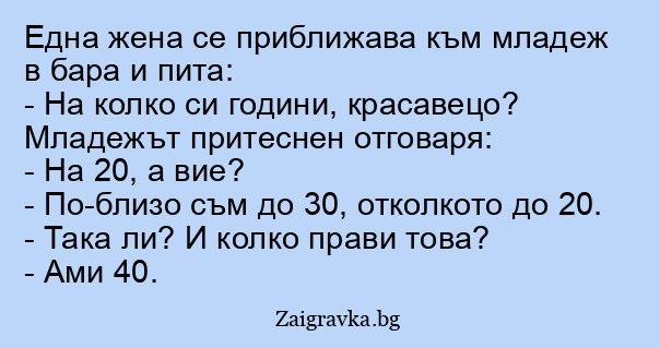 Една жена се приближава към младеж в бара и пита: