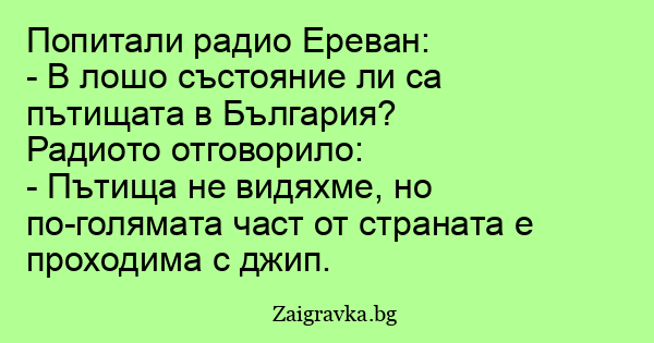 Веднъж се обадили в радио Ереван и попитали къде жените са най-гроэни. След дълго мълчание радио Ереван отговорило: