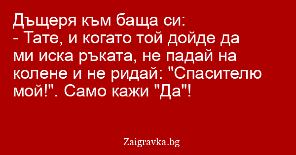 - Тате, и когато той дойде да ми иска ръката, не падай на колене и не ридай: "Спасителю мой!". Само кажи "Да"!