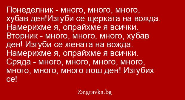 Вторник - много, много, много, хубав ден! Изгуби се жената на вожда. Намерихме я, опрайхме я всички.