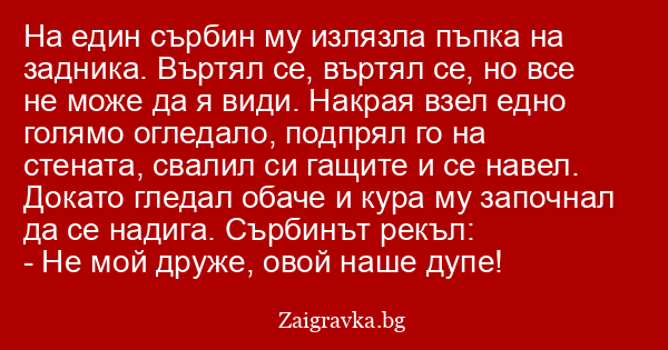 На един сърбин му излязла пъпка на задника. Въртял се, въртял се, но все не може да я види. Накрая взел едно голямо огледало, подпрял го на стената, свалил си гащите и се навел. Докато гледал обаче и кура му започнал да се надига. Сърбинът рекъл: