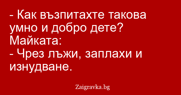 - Мамо, нали ми каза, че ако смучеш мръсни пръсти, то в коремчето ти ще се завъдят глисти! А какво трябва да смучеш, за да си завъдиш бебенце?!