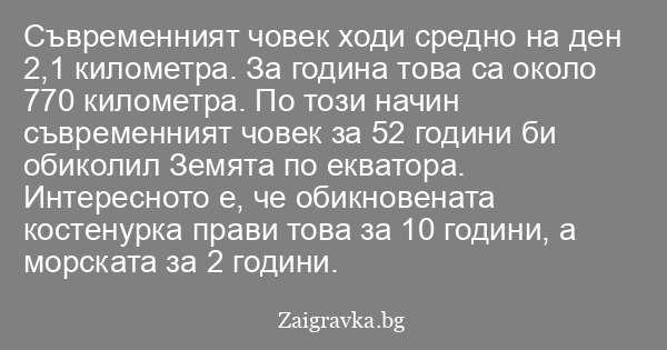 Съвременният човек ходи средно на ден 2,1 километра. За година това са около 770 километра. По този начин съвременният човек за 52 години би обиколил Земята по екватора. Интересното е, че обикновената костенурка прави това за 10 години, а морската за 2 години.
