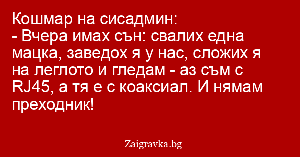- Вчера имах сън: свалих една мацка, заведох я у нас, сложих я на леглото и гледам - аз съм с RJ45, а тя е с коаксиал. И нямам преходник!