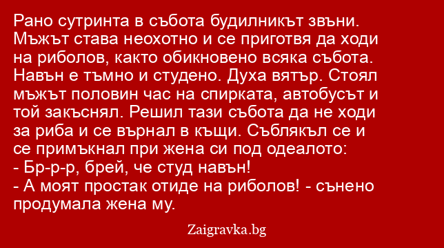 Рано сутринта в събота будилникът звъни. Мъжът става неохотно и се приготвя да ходи на риболов, както обикновено всяка събота. Навън е тъмно и студено. Духа вятър. Стоял мъжът половин час на спирката, автобусът и той закъснял. Решил тази събота да не ходи за риба и се върнал в къщи. Съблякъл се и се примъкнал при жена си под одеалото: