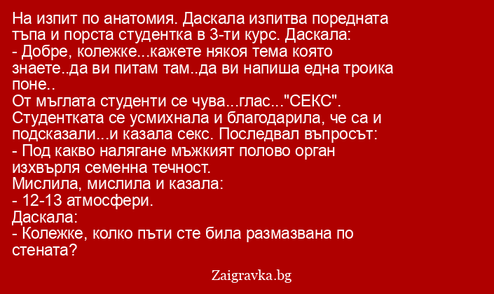 На изпит по анатомия. Даскала изпитва поредната тъпа и порста студентка в 3-ти курс. Даскала: