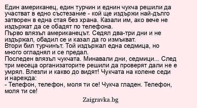 Един американец, един турчин и еднин чукча решили да участват в едно състезание - кой ще издържи най-дълго затворен в една стая без храна. Казали им, ако вече не издържат да се обадят по телефона.