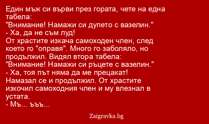 Намазал се и продължил. От храстите изкочил самоходния член и му влезнал в устата.