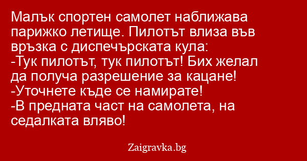 Малък спортен самолет наближава парижко летище. Пилотът влиза във връзка с диспечърската кула: