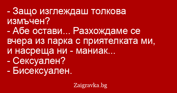- Абе остави... Разхождаме се вчера из парка с приятелката ми, и насреща ни - маниак...