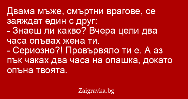 - Знаеш ли какво? Вчера цели два часа опъвах жена ти.