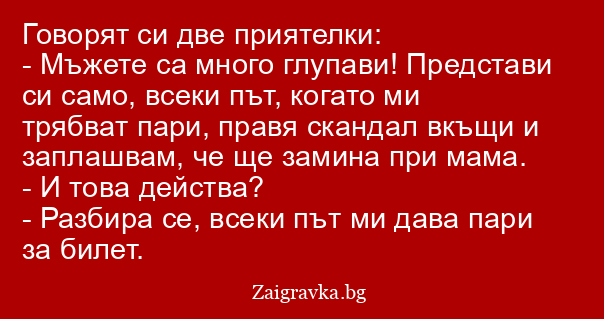- Мъжете са много глупави! Представи си само, всеки път, когато ми трябват пари, правя скандал вкъщи и заплашвам, че ще замина при мама.
