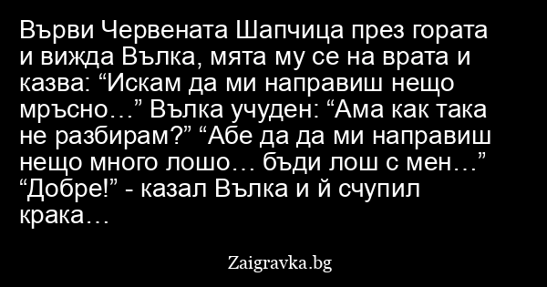 Върви Червената Шапчица през гората и вижда Вълка, мята му се на врата и казва: “Искам да ми направиш нещо мръсно…” Вълка учуден: “Ама как така не разбирам?” “Абе да да ми направиш нещо много лошо… бъди лош с мен…”