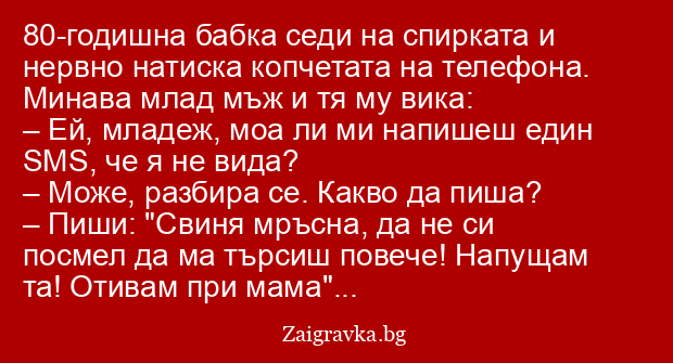 80-годишна бабка седи на спирката и нервно натиска копчетата на телефона. Минава млад мъж и тя му вика: