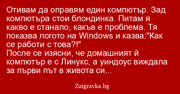 Отивам да оправям един компютър. Зад компютъра стои блондинка. Питам я какво е станало, какъв е проблема. Тя показва логото на Windows и казва:"Как се работи с това?!"