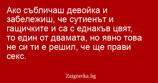 Ако събличаш девойка и забележиш, че сутиенът и гащичките и са с еднакъв цвят, то един от двамата, но явно това не си ти е решил, че ще прави секс.