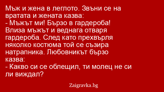Мъж и жена в леглото. Звъни се на вратата и жената казва: