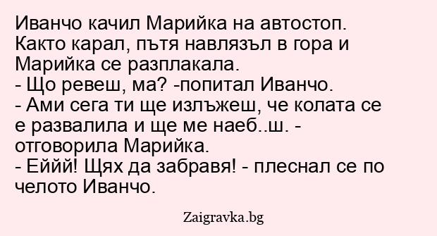 Иванчо качил Марийка на автостоп. Както карал, пътя навлязъл в гора и Марийка се разплакала.