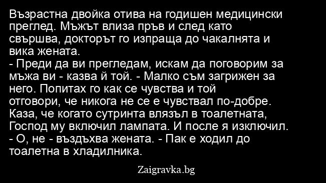 Възрастна двойка отива на годишен медицински преглед. Мъжът влиза пръв и след като свършва, докторът го изпраща до чакалнята и вика жената.