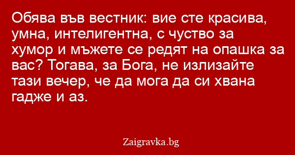 Обява във вестник: вие сте красива, умна, интелигентна, с чуство за хумор и мъжете се редят на опашка за вас? Тогава, за Бога, не излизайте тази вечер, че да мога да си хвана гадже и аз.
