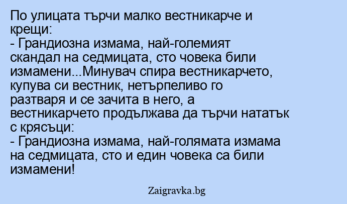 - Грандиозна измама, най-големият скандал на седмицата, сто човека били измамени...Минувач спира вестникарчето, купува си вестник, нетърпеливо го