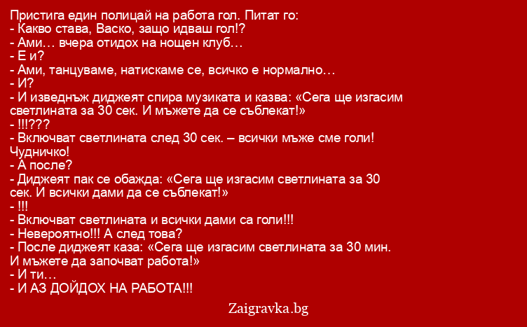 - И изведнъж диджеят спира музиката и казва: «Сега ще изгасим светлината за 30 сек. И мъжете да се съблекат!»