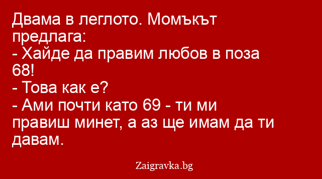 - Да! Поза номер 54 от Кама Сутра- мъж гледа в ухото на жената.