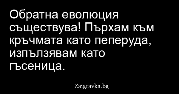 Обратна еволюция съществува! Пърхам към кръчмата като пеперуда, изпълзявам като гъсеница.
